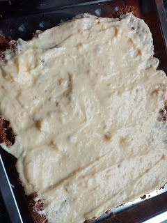 Deasupra punem budinca de ciocolata pregătită dupa instrucțiuni (inloccuim laptele cu coc cola) sau topim o ciocolata.